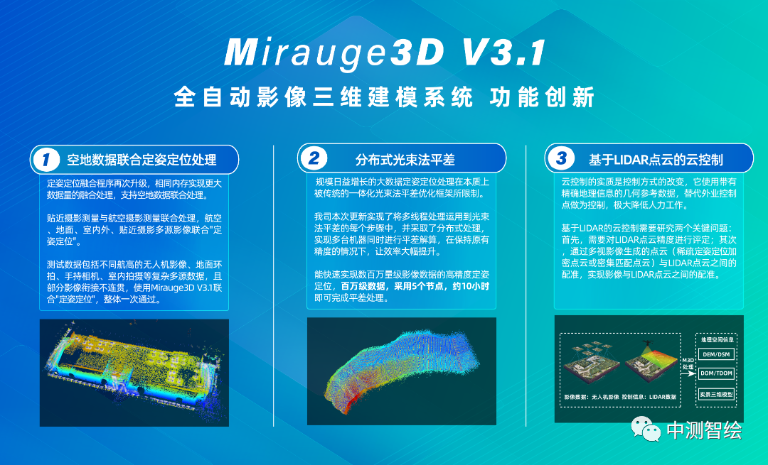 中测智绘携Mirauge3D V3.1硬核亮相,在V3.0的基础上提升了空三处理数据量与模型重建精度;新增了工程拆分与合并功能、模型水面修复功能、一键镶嵌匀光的快拼新模式、坐标转换小插件等。除此之外,还新增三项创新功能,具体如下: