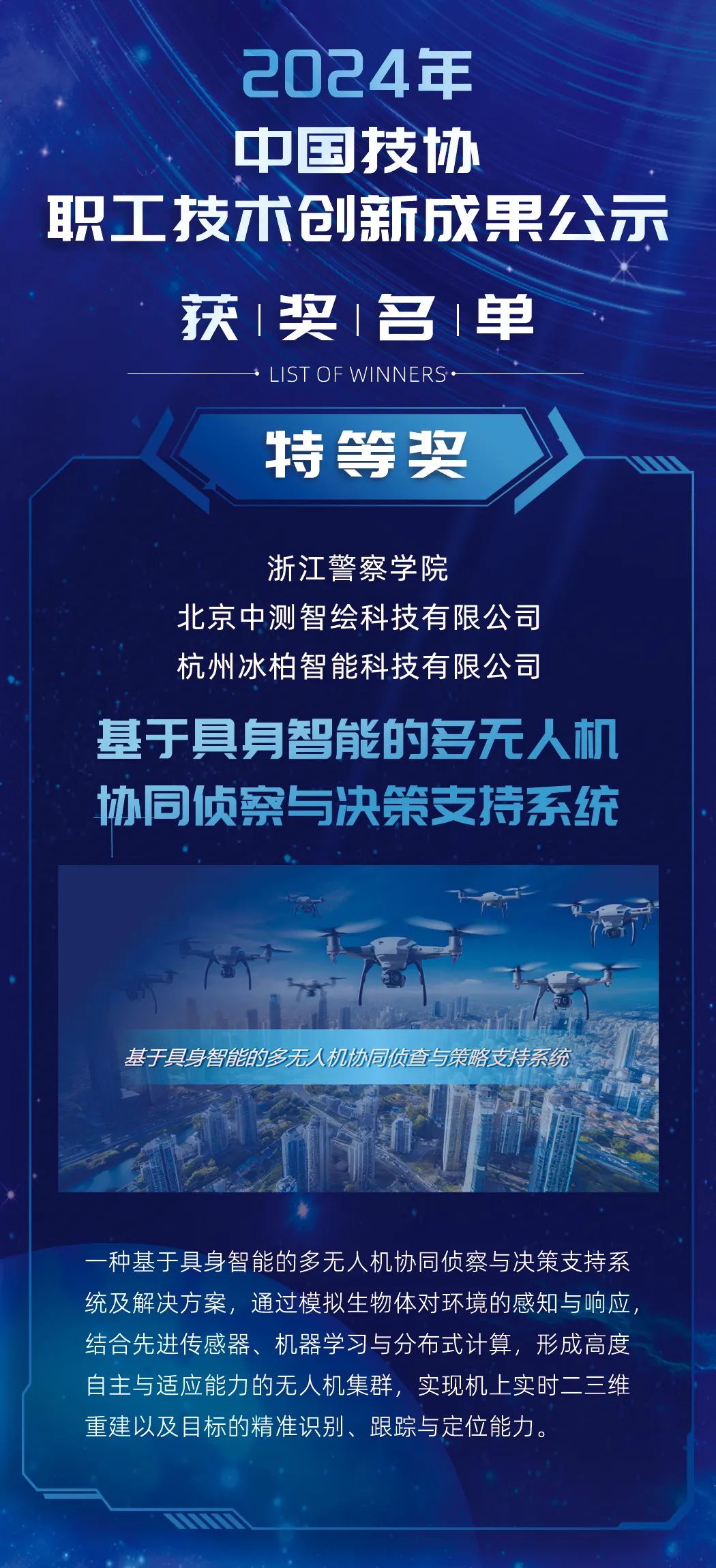 近日,中国职工技术协会正式公布了2024年职工技术创新成果评审工作的结果,我司冰柏科技与浙江警察学院联合研发的【基于具身智能的多无人机协同侦察与决策支持系统】荣获特等奖。
