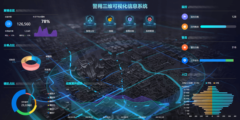 页面显示的数据信息包括:案情总览、分类占比、辖区占比、结案案件趋势、监控总览、警员数据、人口数据等。基于城市的三维实景模型,集成“一标三实可视化”、“监控虚实融合”、“巡查与预警“”、“地物管理与定位”、“执法记录仪管理”等多个场景功能模块和“三维浏览与测量”、“监控可视域分析”等三维GIS应用。一标三实可视化
