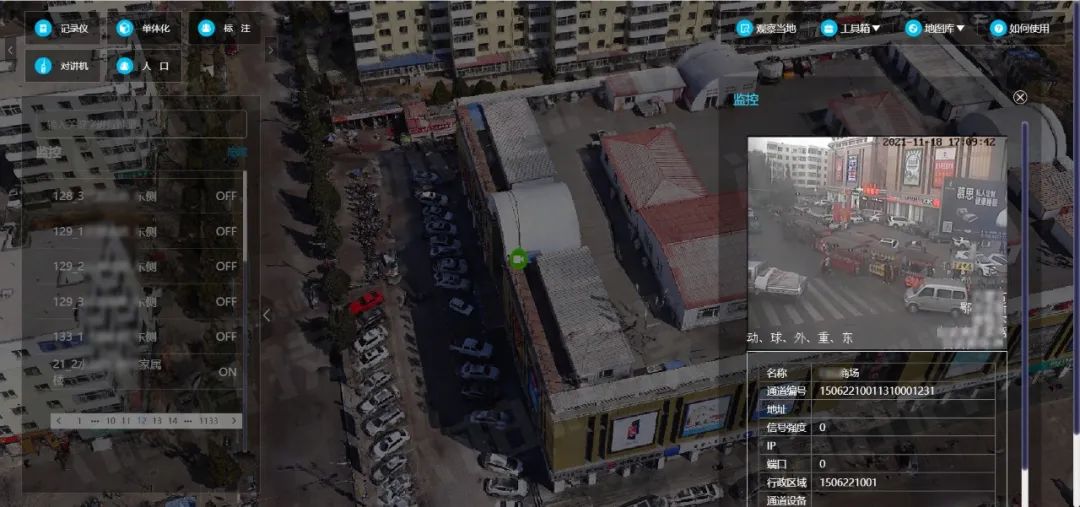 全域实时监控查看,平台提供接口,支持接入监控设备等常用传感器,对管辖区域内监控设备建档并统一管理,并支持在实景三维地图中实时跳转,即点即看。