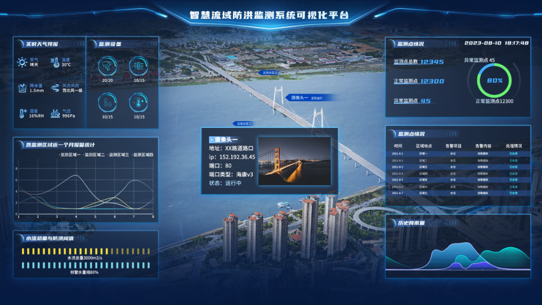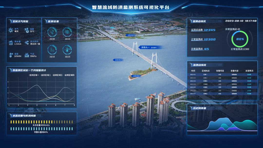 通过AIris3实景三维应用系统渲染 TB 级江河流域模型,结合“一张图大屏”,实时直观展示气象要素、雨量观测、报警数量、应急预案、物资情况、排涝情况等数据。