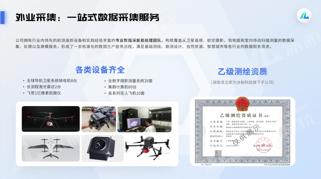 通过高分辨率航天、航空遥感技术和地面水文监测技术的有机结合,推进建立流域洪水“空天地”一体化监测系统,提高流域洪水监测体系的覆盖度、密度和精度。对目标流域内河流的上下游、左右岸、干支流,及相关水域水利建设的工程体系、影响范围、经济社会要素等现实条件进行数字化,形成二维图像图表和三维仿真模型来对物理世界进行数字映射展示。冰柏科技拥有行业内领先的航测遥感设备和实践经验丰富的专业数据采集和处理团队,具有标准化的数据生产服务流程,满足基础测绘、勘测设计、自然资源、智慧城市等各行业的数据服务需求。