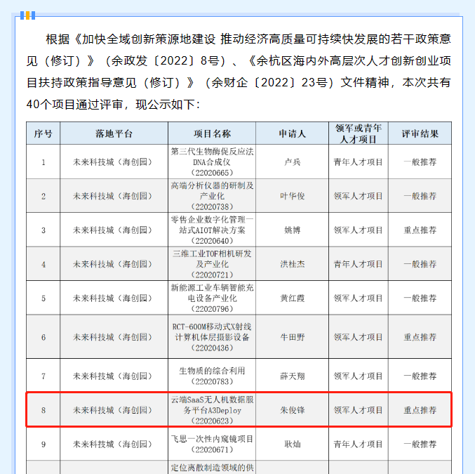 根据《加快全域创新策源地建设推动经济高质量可持续快发展的若干政策意见(修订)》和《余杭区海内外高层次人才创新创业项目扶持政策指导意见(修订)》文件精神,以A3Deploy为典型代表的40个项目顺利通过评审,评审结果为「重点推荐」的「领军人才项目」。