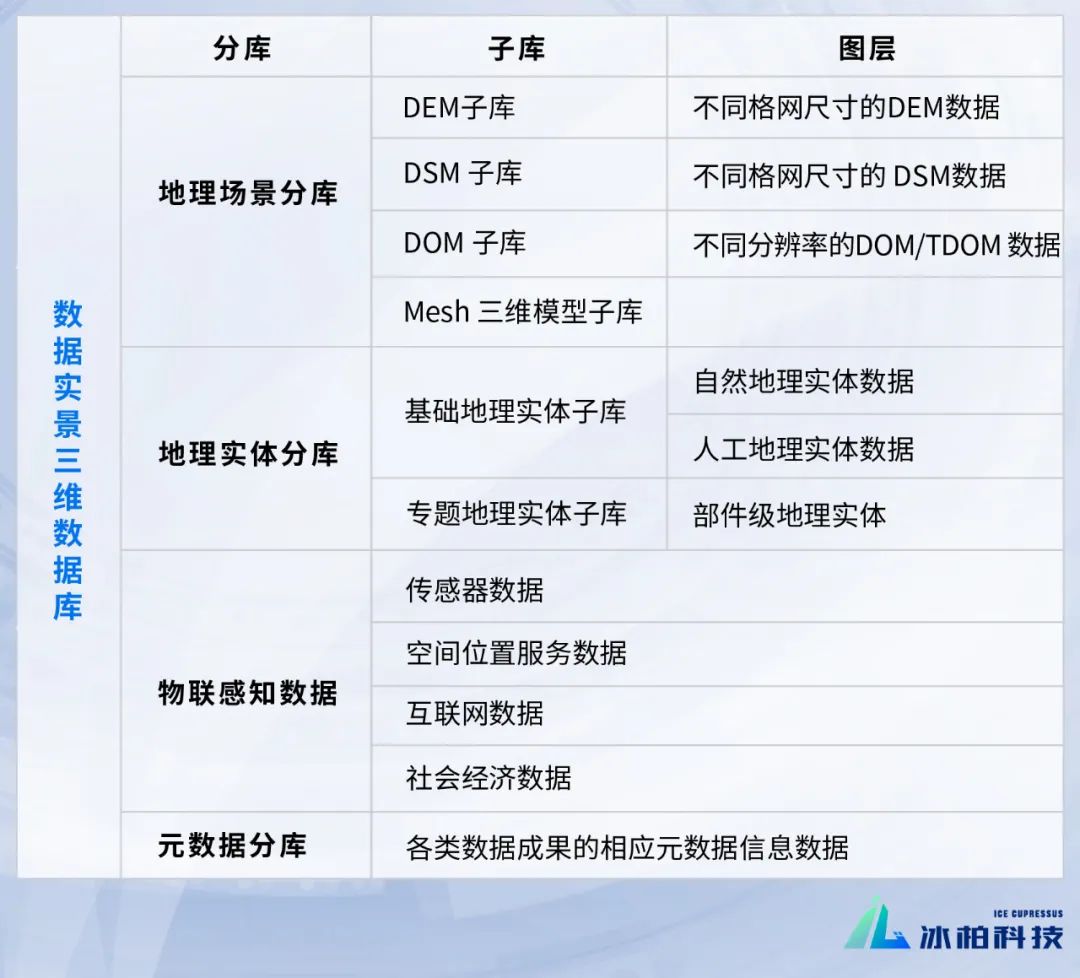 数据实景三维数据库包括地理场景分库、地理实体分库、物联感知数据分库和相应元数据分库等,各分库根据数据内容细化为不同子库,各子库根据数据内容分为若干图层。