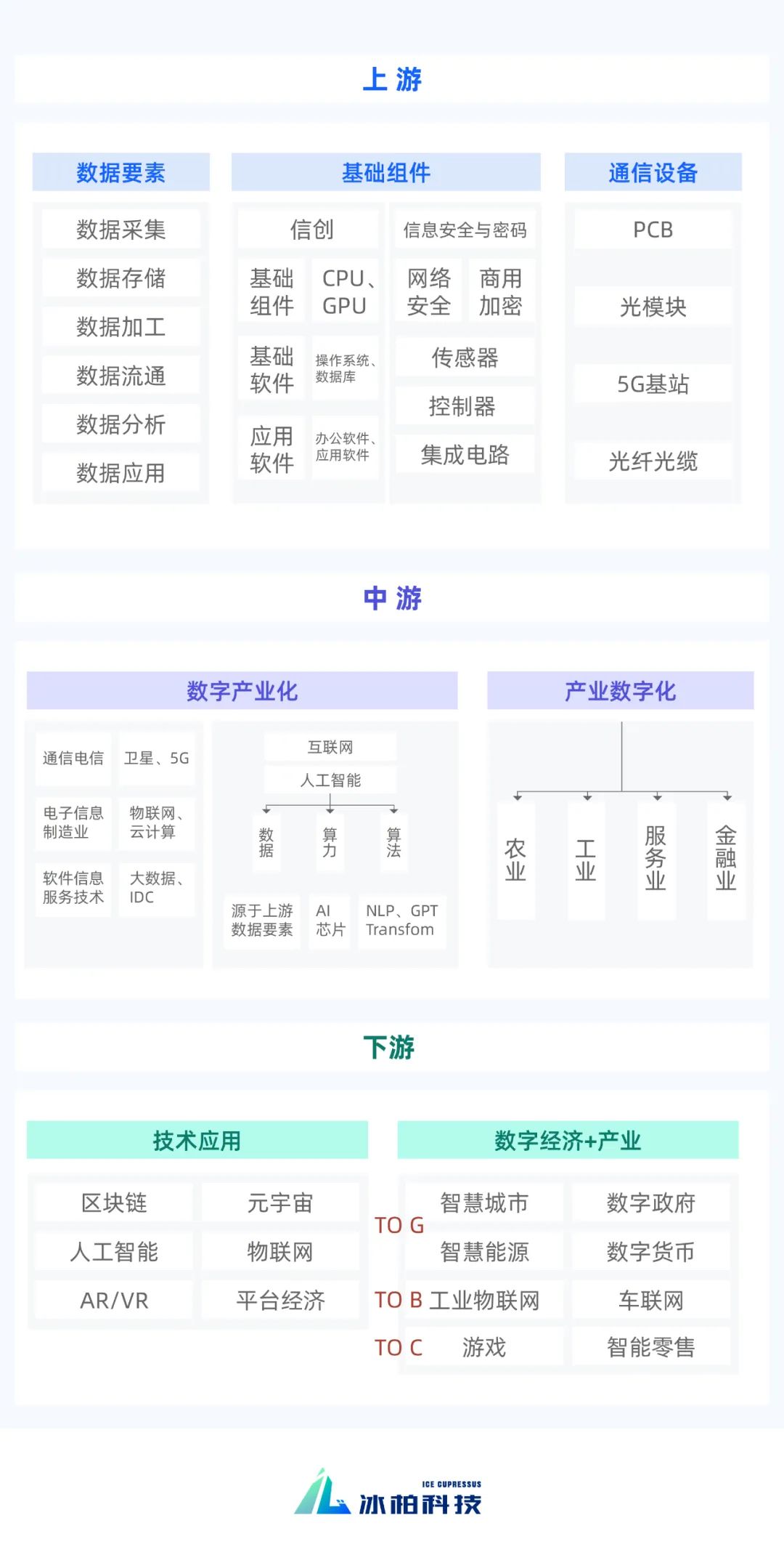 上游是数字产业的基础要素,如数据要素、基础组件和通信设备。数据要素又进一步细分为采集、存储、加工等。基础组件包括信创、信息安全与密码等。通信设备里涉及有PCB、光伏板、光纤光缆等。