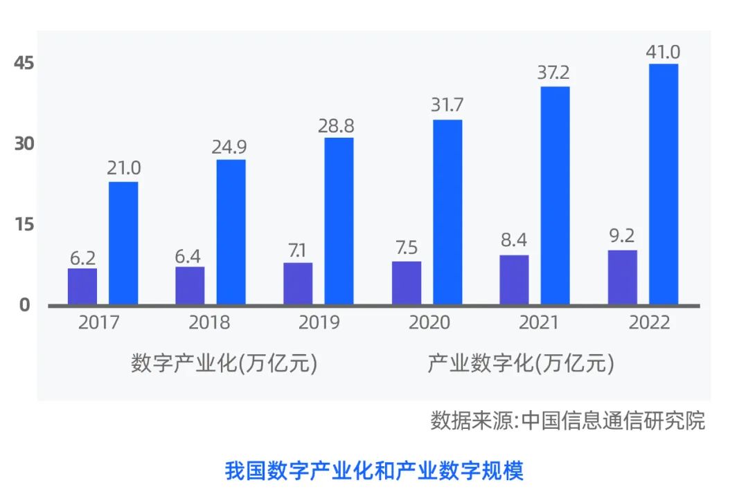 2022 年,我国数字产业化的规模和产业数字化的规模分别是 9.2 万亿和 41 万亿,这两个加起来已经占到目前中国 GDP 总量的 41.5%。