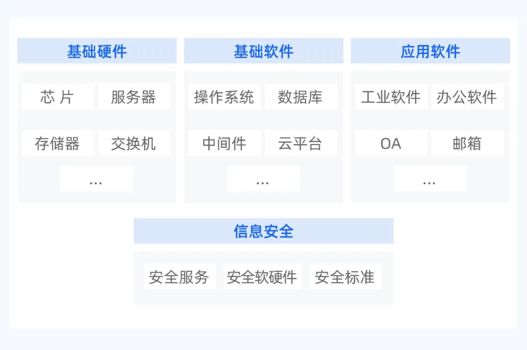 在上游产业中,信创产业是将信息技术应用创新的产业,主要目的在于自主研发基础软件产品,实现对国外引进产品的替代。过去我们用市场换空间、换技术,现在则用技术占领市场。