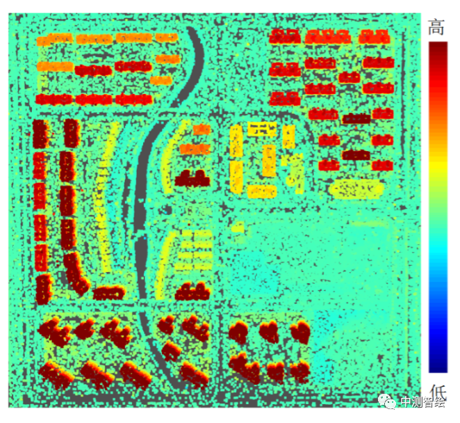 测区密集建筑群概况(由Mirauge3D处理所得空三成果可直观体现地物高度关系)