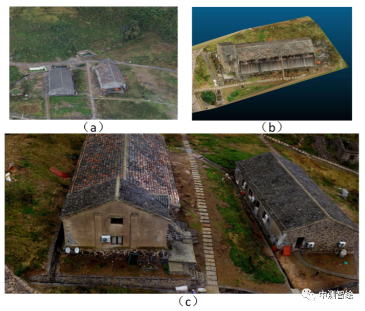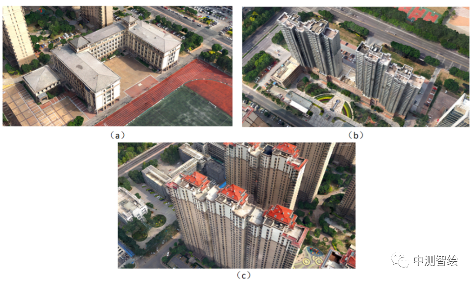 基于Mirauge3D软件的三维模型成果部分截图,(a)为低层建筑三维模型成果,(b)为中层建筑三维模型成果,(c)为高层建筑三维模型成果