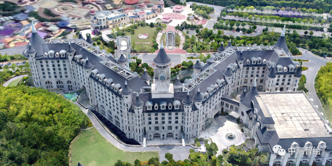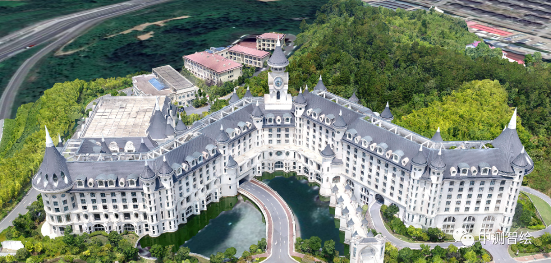 本次项目选取了浙江省某度假区的城堡酒店,该建筑占地面积超过26,000平方米,该建筑包含大量拱门,廊桥等复杂结构,建筑凹槽较多,所以常规无人机航线飞行难以满足精细化建模的进度要求。采用单镜头环绕飞行不仅可以减少倾斜摄影采集的影像数量,同时拍摄角度也更加丰富。