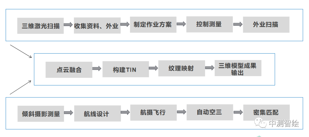 三维激光扫描与倾斜摄影技术的结合,实现了空中无人机航空影像与地面三维激光点云的“空地联合”,全方位无死角获取地表物体的完整表面坐标信息,实现高精度的三维建模,主要的作业流程如图12所示。