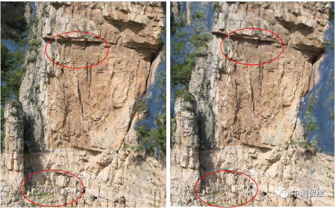 为了评价融合三维激光点云后建立的三维模型与单纯无人机倾斜摄影测量建立的三维模型效果,分别建立了三维模型,模型的效果如图13所示。对比模型的表面可以直观地看出,融合了激光点云之后建立的三维模型,墙面更加平整,底部效应得到改善、拉花现象明显减弱,模型效果得到极大优化。