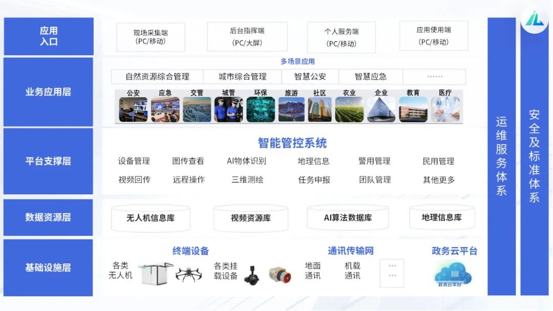 以“集约高效、共享开放、安全加固”为思路,破解无人机管理分散、应用场景单一、使用效能不足等痛点,构建统一服务运维、统一智慧调度、统一飞机体系、多载荷配置体系、多业务场景服务、多任务执行规范化的无人机综合智能管控平台。随着低空经济发展,为政府新型智慧城市治理提供集约化服务是必要路径,将智能化管控平台逐步与新型智慧城市衔接,形成集成公安、城管、应急、自然资源管理多行业无人机集成服务,助力数字城市精细化发展。无人机智能管控平台通过分层架构整合无人机技术,提供设备管理、AI识别、三维测绘等功能,应用于自然资源、城市管理、公安、应急等多领域,通过PC、移动设备等多终端实现全方位智能管理和服务。1. 网联化基础设施