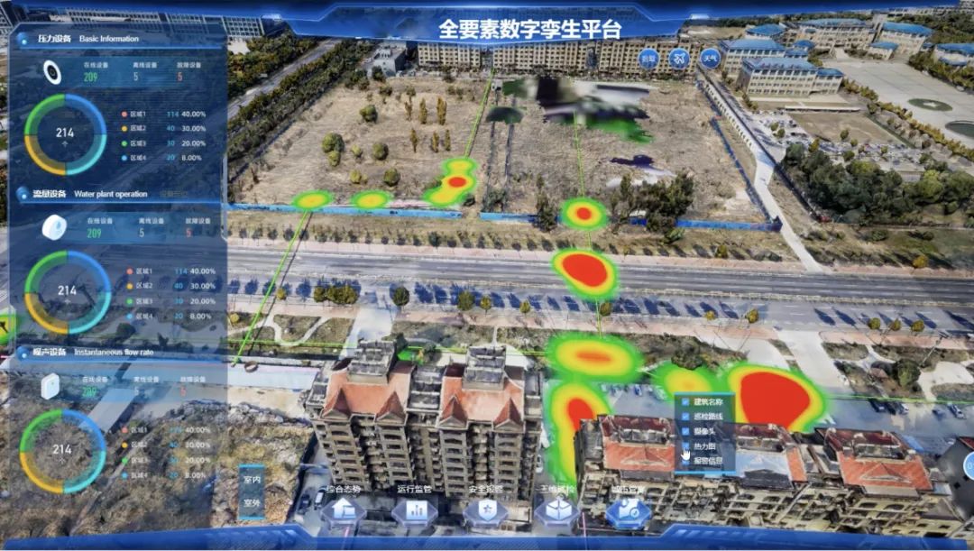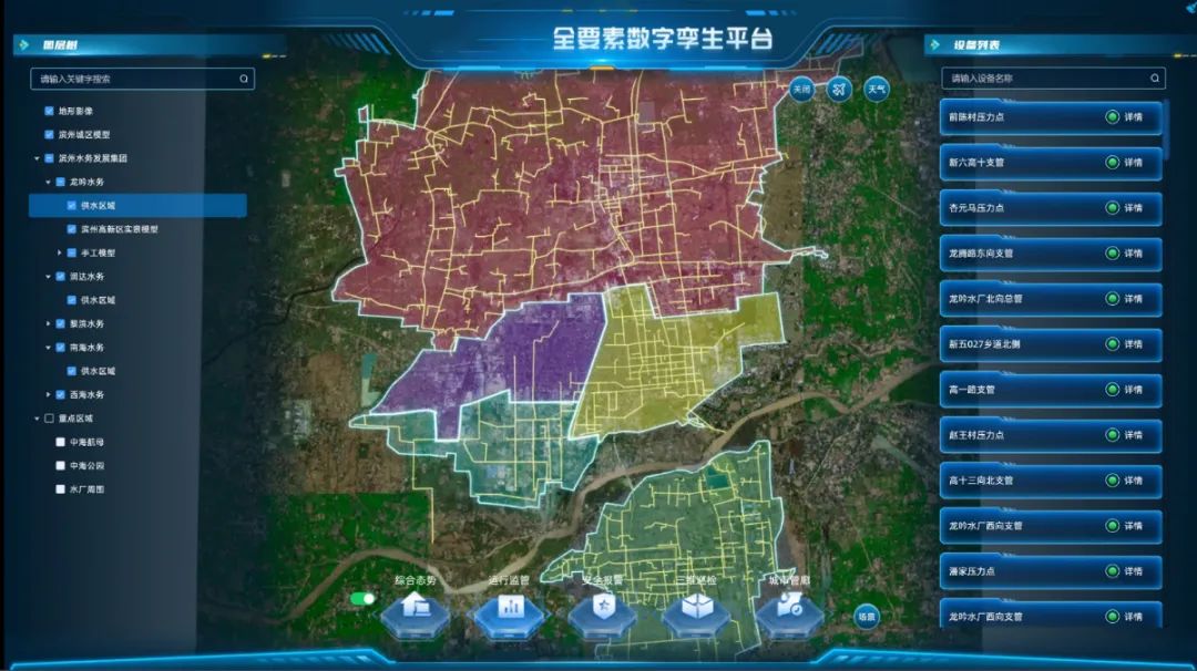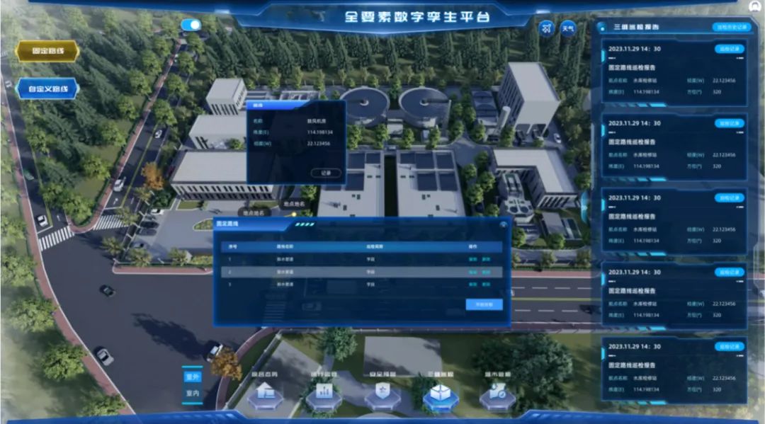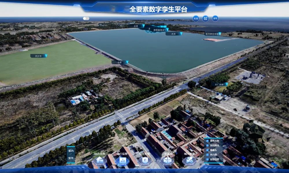 在实景三维数据中进行统筹规划,供水区域管网和各类设备与终端现场实际地形场景协调融合,便于后期工作的规划和施工,使最终方案确定直观化、与周边环境协调,促进水务管理工作的精细化、科学化。通过三维建模技术,对水库、水厂内外建筑构件仿真模型,并按照实际比例及布局,还原水厂的地形地貌及区域环境。包括了对各种关键信息和数据的集成、展示和分析,帮助管理人员全面了解水厂的运营状况、和设备状态,为管理决策提供支持。支持固定路线或自定义路线漫游观察,满足用户不同需求。飞行漫游技术让用户沉浸在与实际环境高度相似的数字孪生模型中,以更直观的方式获取信息,加深对水厂设备布局、地理位置和空间关系的理解。用户可根据需求快速切换场景内主要区域和建筑,实现全方位展示。以标签形式标注建筑、监控和巡检路线,点击标签可快速跳转到对应位置。场景模型展示各建筑的真实监控点位,接入IOT监控设备,点击标签可显示实时监控画面。天气切换展示