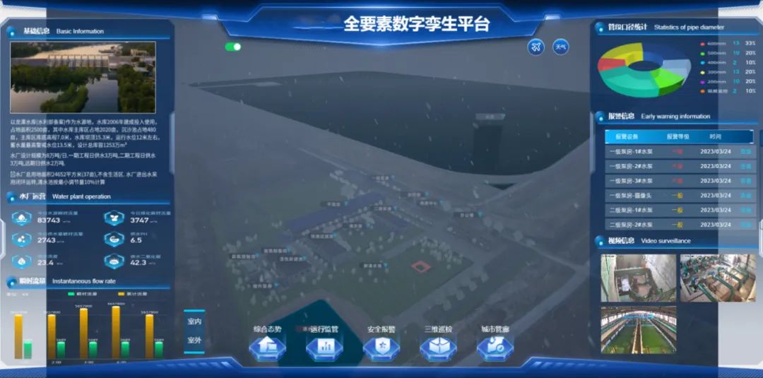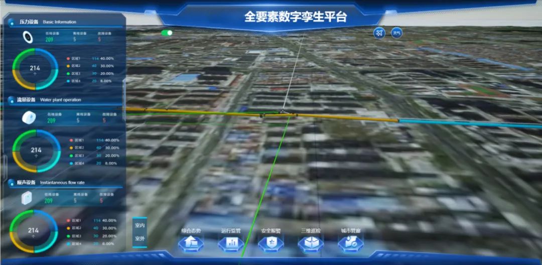 集成水厂、管网节点的感知数据,并基于可视化三维模型,集中进行监视和管理,直观的展示系统实时运营参数,将生产实时数据、仪表数据、视频监控画面、关键指标数据实景体现,通过模型各个角度有效监控各关键指标。