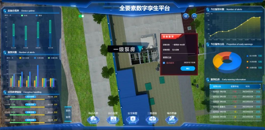 对图层树中不同层级的单位或者建筑进行设备的分类管理汇总,可查看具体某一设备可以进行跳转切换查看实时数据。数字化水厂与预警平台结合,实现系统状态的实时监控和响应。数字孪生平台能够迅速触发安全报警,及时通知操作或管理人员,实现对危险情况的预警和快速响应,确保人员和设备安全。这有效发现并解决各类安全隐患,预防事故发生,减少设备故障、停产、损失等不利影响,保障水厂运营的稳定性和安全性。