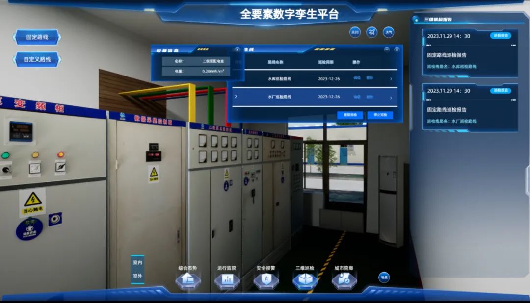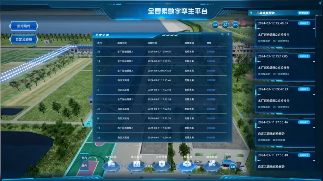 根据水厂日常运营的巡检工作,可设置几条固定的巡检路线,方便周期化的巡检。随时可以发起三维巡检,查看实际水务系统的运行状况,并数字化记录巡检过程,可回溯可跟踪,可视化串联设备、监控、工艺流程,帮助水厂运维即时发现问题,在设备故障之前就采取行动,减少停工时间和维修成本。