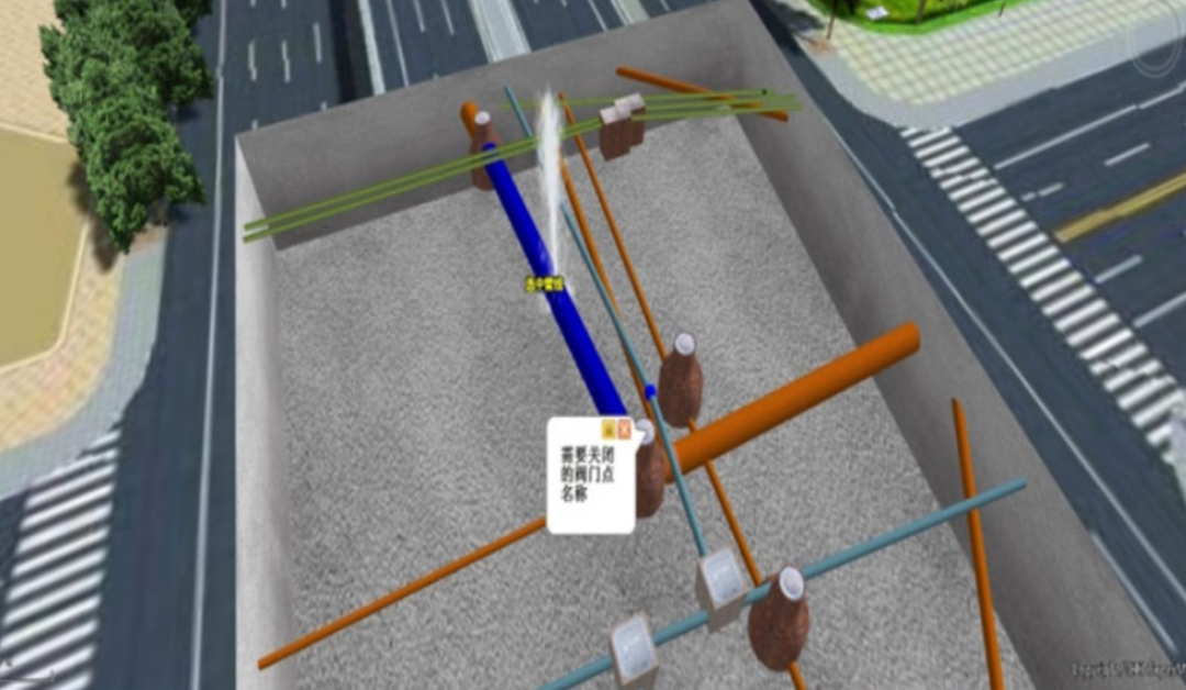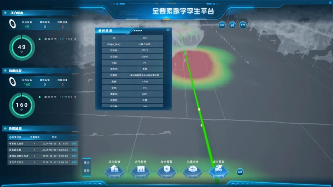 还原城市地下综合管廊,可视化统一集成式管理,提高运维效率。从以下几种视角查看。从宏观视角查看整个城市的管廊分布,从施工视角查看各类管廊排布与设备信息,横切面视角精细查看管廊尺寸。实时显示管网上压力设备和流量设备的在线情况,以及管网上监测设备的报警情况。